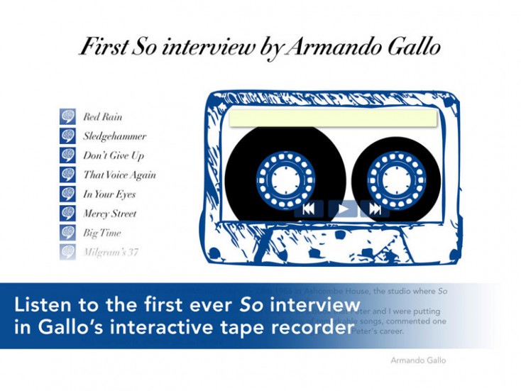 Peter has given photographer and journalist Armando Gallo (along with software development house Zentric) access to music, videos and other material related to the So album in order for them to create a new So iPad app which is now available from the Apple App store.